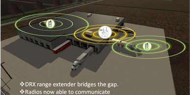 The DRX Ranger extender bridges the coverage gap by receiving the signal from the transmitting radio and re-transmitting it to the receiving radio that is out-of-range.